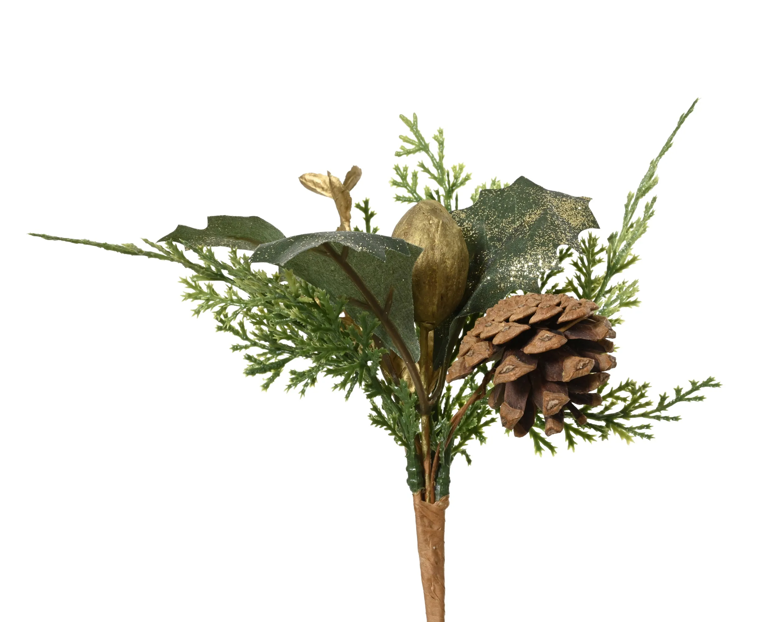 Κλαδί με μούρα και κουκουνάρια χιονισμένο, πράσινο και χρυσό 19 cm